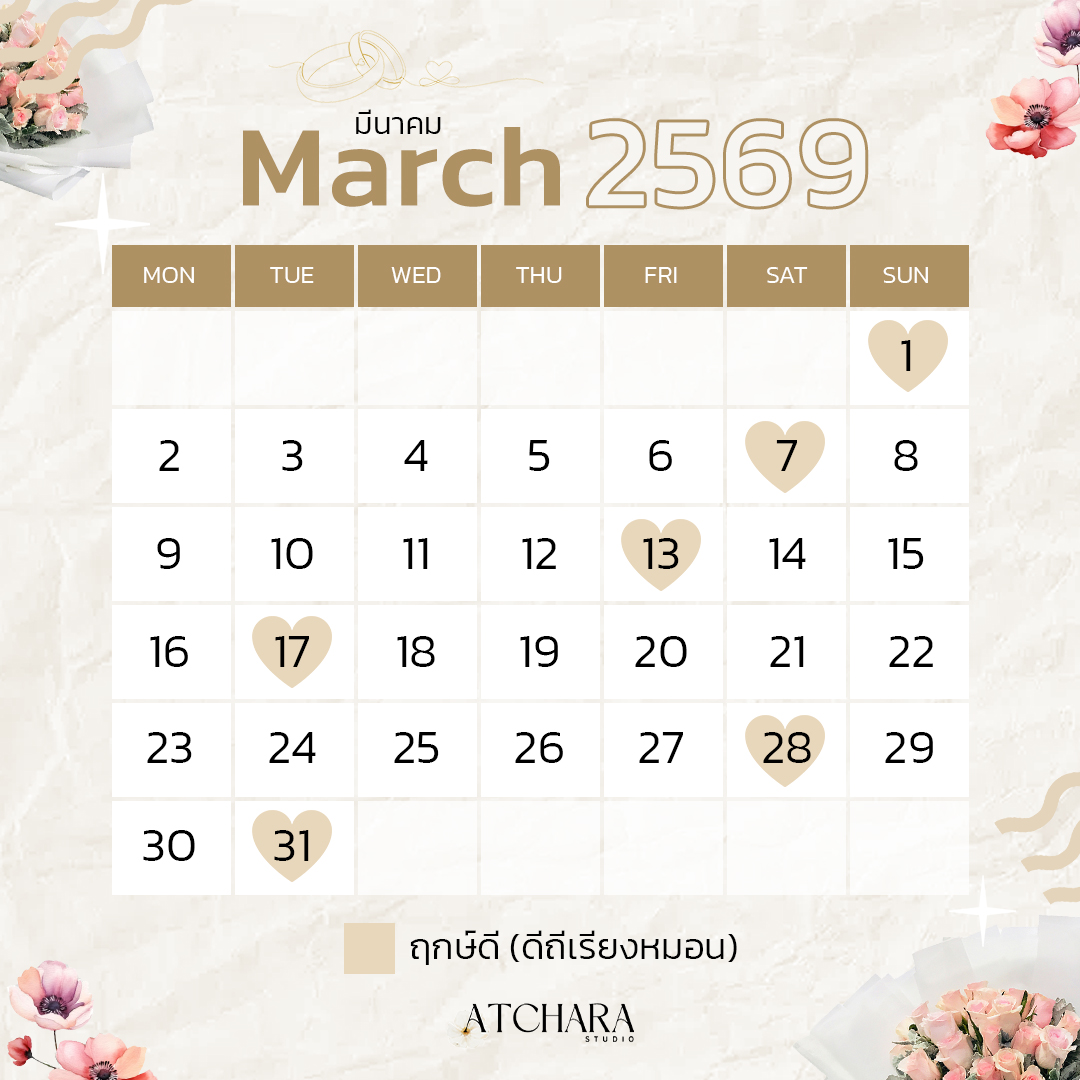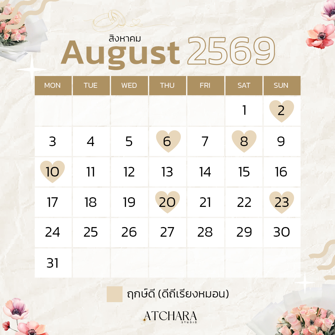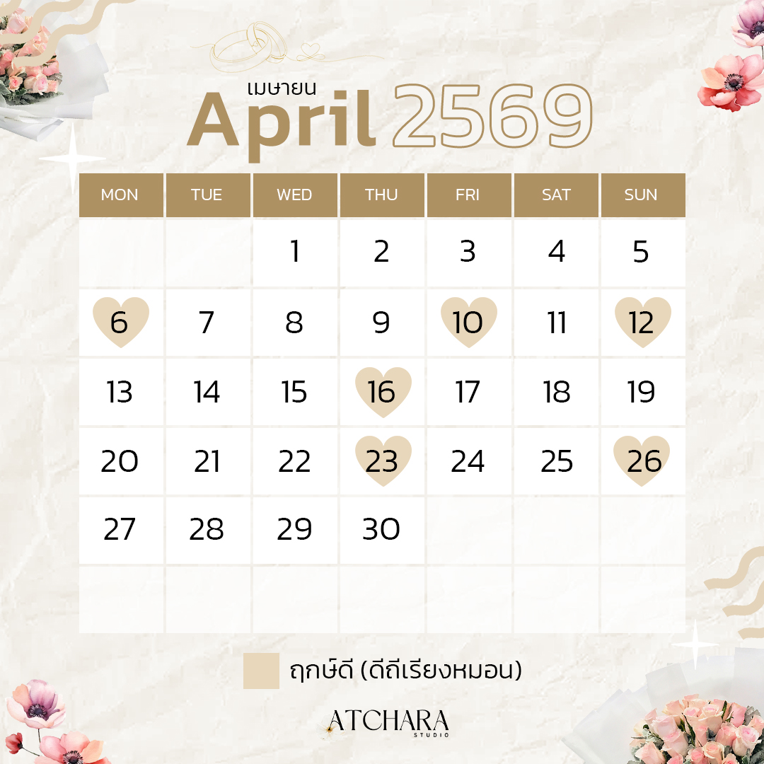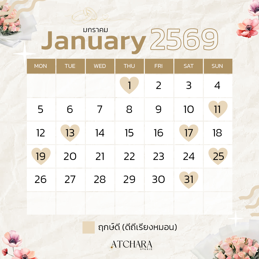 เพื่อให้วันสำคัญของคุณเต็มไปด้วยพลังบวกและความหมายดี ๆ วันนี้ Atchara Wedding Studio รวบรวม “ฤกษ์แต่งงานมงคลปี 69” แยกตามเดือนมาให้คุณเลือกอย่างสบายใจ