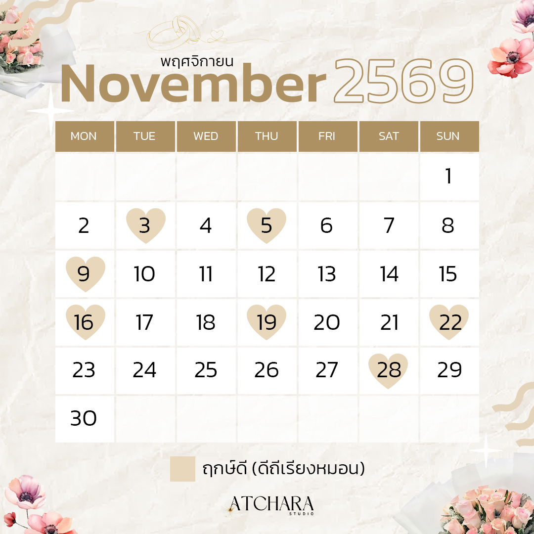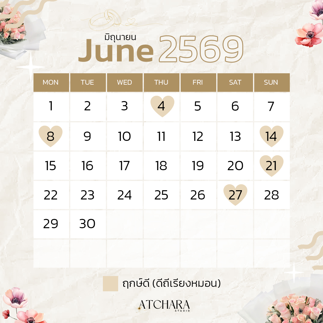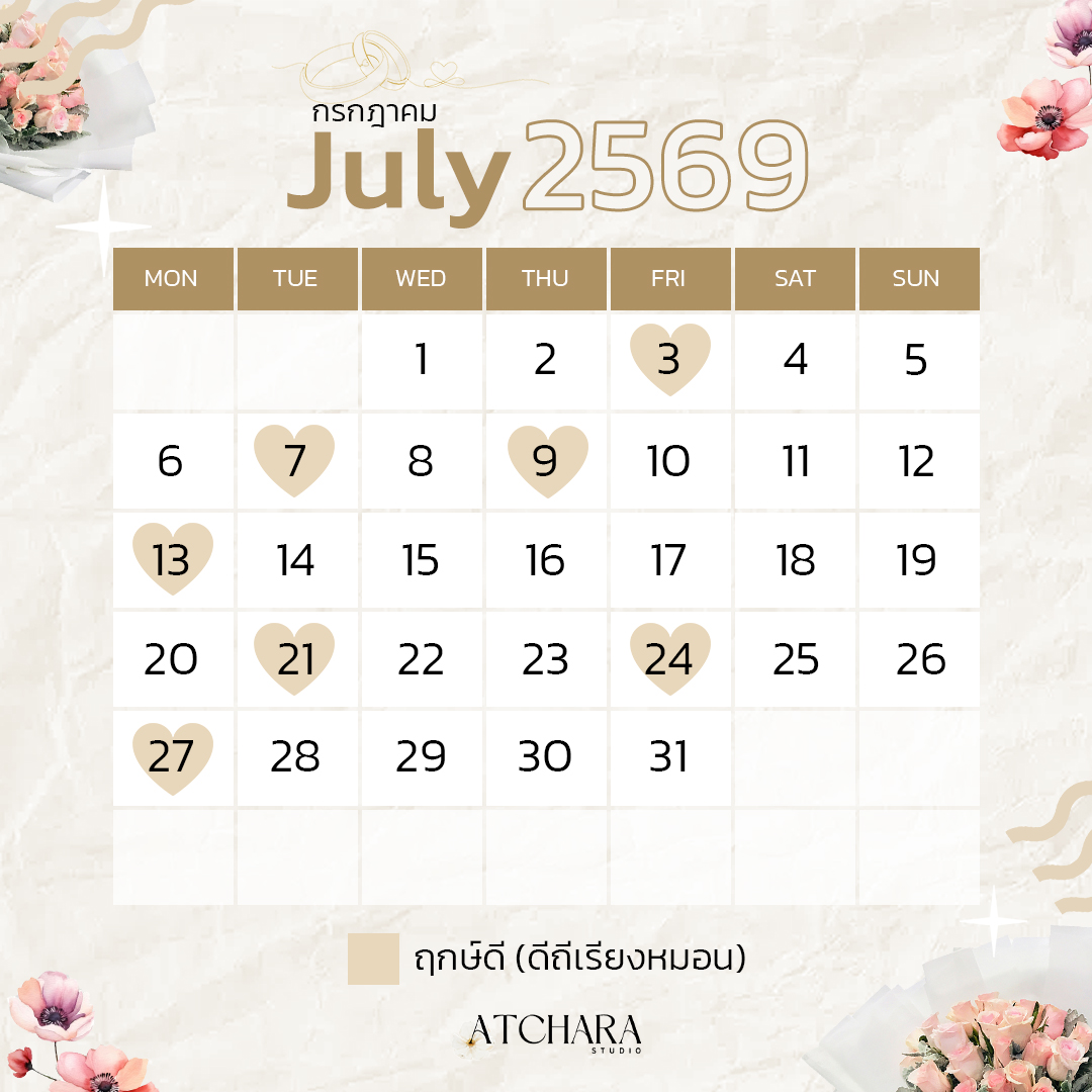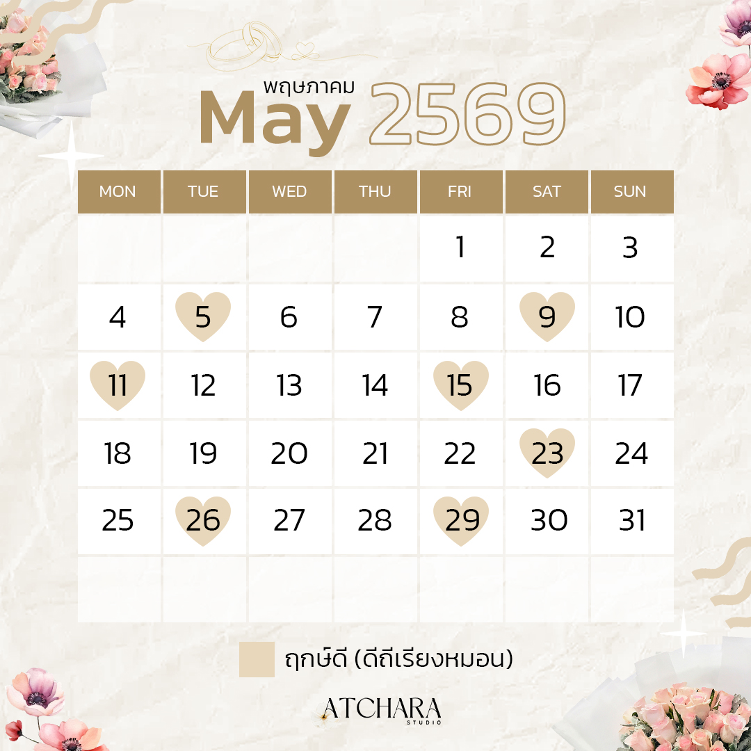 เพื่อให้วันสำคัญของคุณเต็มไปด้วยพลังบวกและความหมายดี ๆ วันนี้ Atchara Wedding Studio รวบรวม “ฤกษ์แต่งงานมงคลปี 69” แยกตามเดือนมาให้คุณเลือกอย่างสบายใจ
